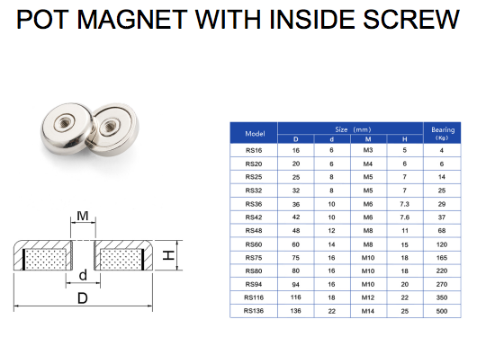 • 产品描述:D16,D20,D25,D32,D36,D42,D48,D60,D75,D80,D94,D116,D136mm磁性组件,钕铁硼锅磁,强磁固定器,平螺纹锅磁,磁铁带直孔,内丝磁性组件超强平螺纹直孔锅磁磁座钢套吸盘
